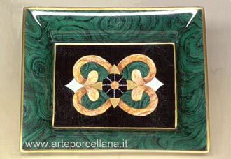 Rectangular tray with malachite effect and marble marquetry, finished in matt gold