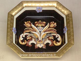 description Octagonal tray with marble marquetry effect, and edge with matt gold ”Technique of trompe l'oeil”