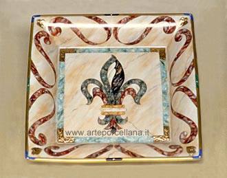 description Square tray with marble marquetry effects, finished in matt gold ”Technique of trompe l'oeil”