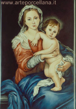 description Porcelain plaque with "Virgin Mary with Child", subject by B. E. Murillo ”American technique”