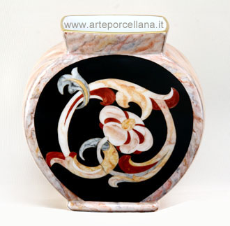 description Vase with pink marble effect and and marble marquetry, finished in matt gold ”Technique of trompe l'oeil”